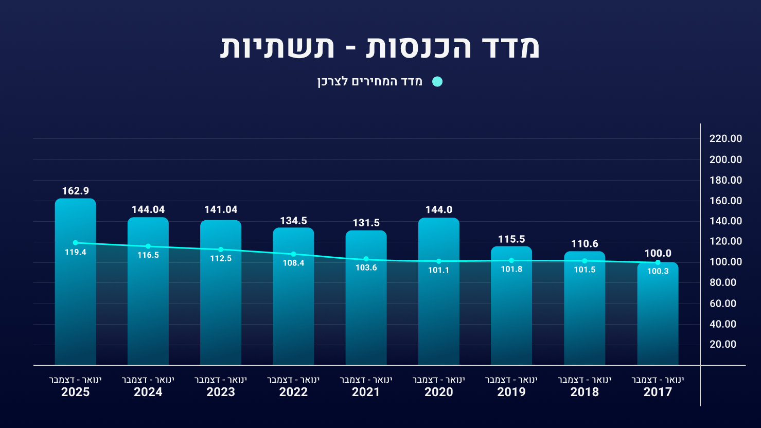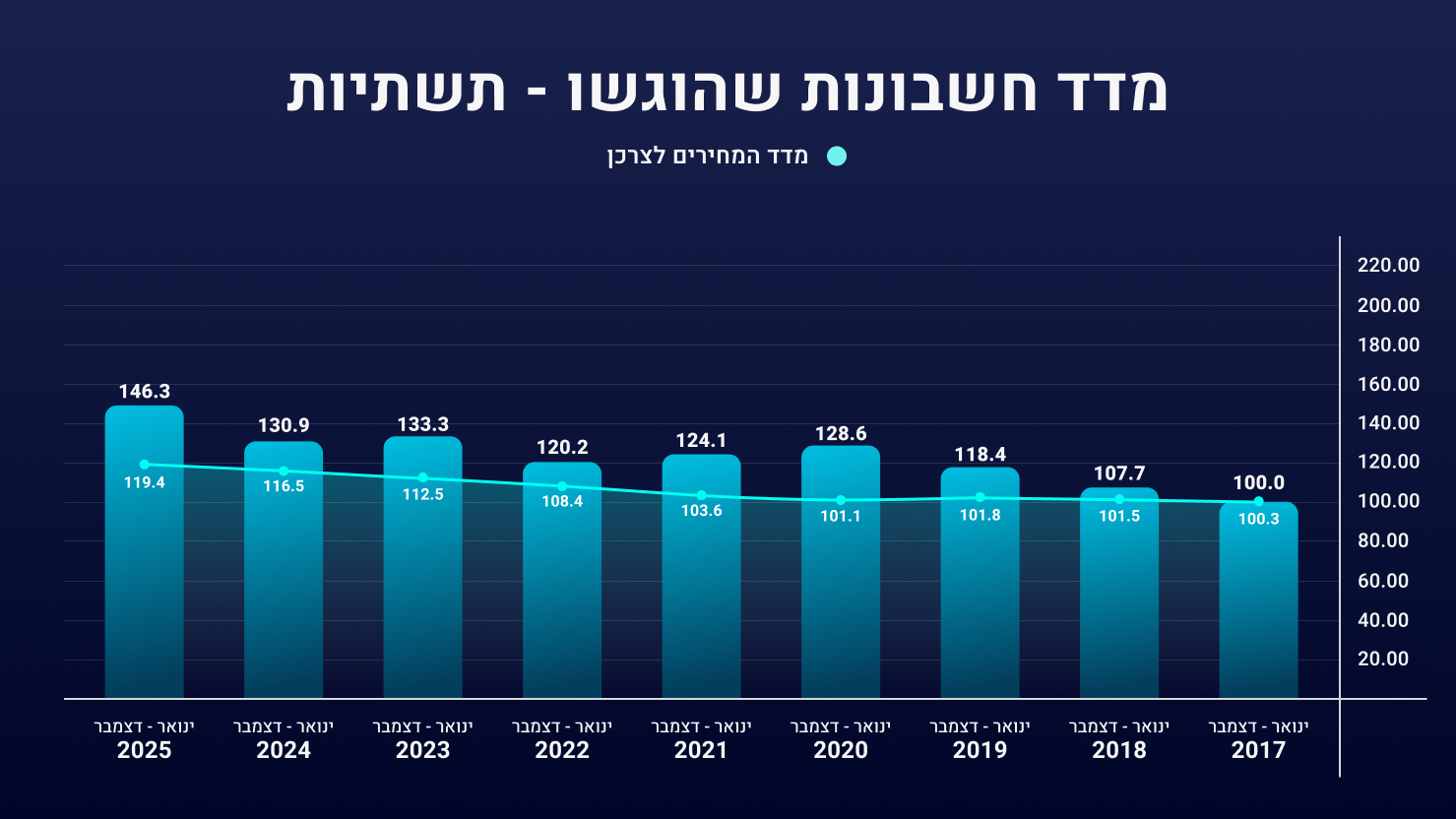 בתחום התשתיות- קצב החשבונות השנה הוא הגבוה ביותר מתחילת תקופת המדידה. קצב החשבונות בשנת 2025 גבוה בכ- 12% משנת 2024 ובכ- 10% משנת 2023. במקביל, מדד המחירים לצרכן עלה בשיעורים נמוכים.
