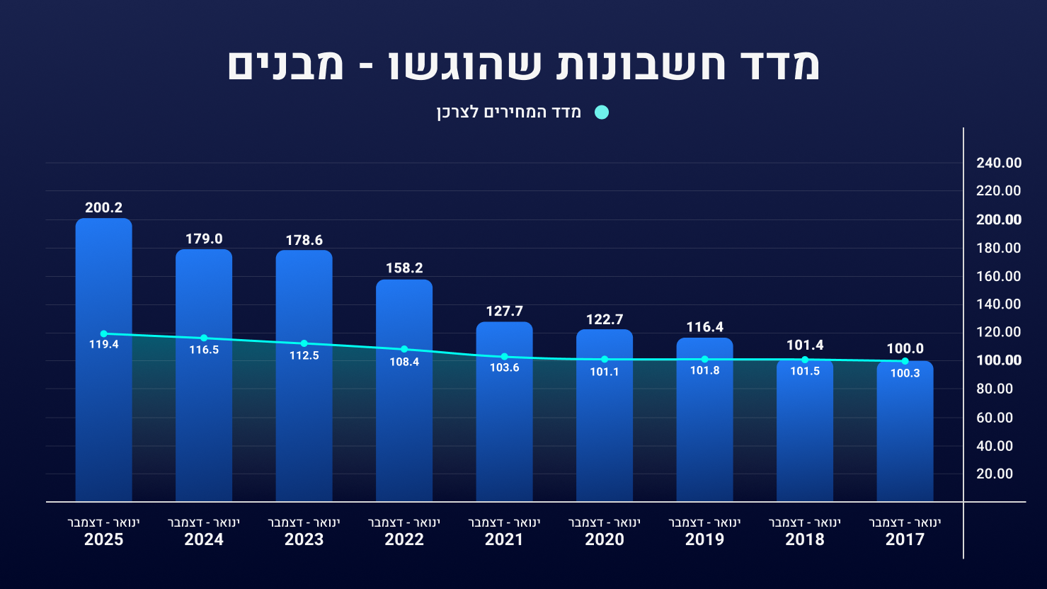 בתחום המבנים – קצב הגשת החשבונות בשנת 2025 עלה בכ- 12% לעומת התקופה המקבילה אשתקד, והגיע לרמת שיא מאז תחילת המדידה.