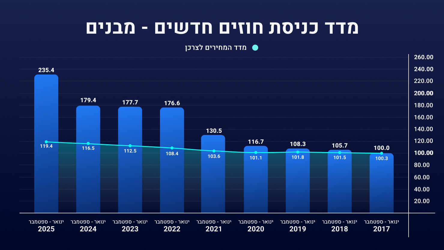 בתחום המבנים- בשנת 2025 נרשמה עלייה חדה של כ- 31% בכניסת חוזים חדשים בהשוואה לשנה שעברה. קפיצה זו באה בזכות חתימת חוזים חסרת תקדים ברבעון הראשון של 2025, במיוחד בתחום הבנייה הרוויה למגורים.