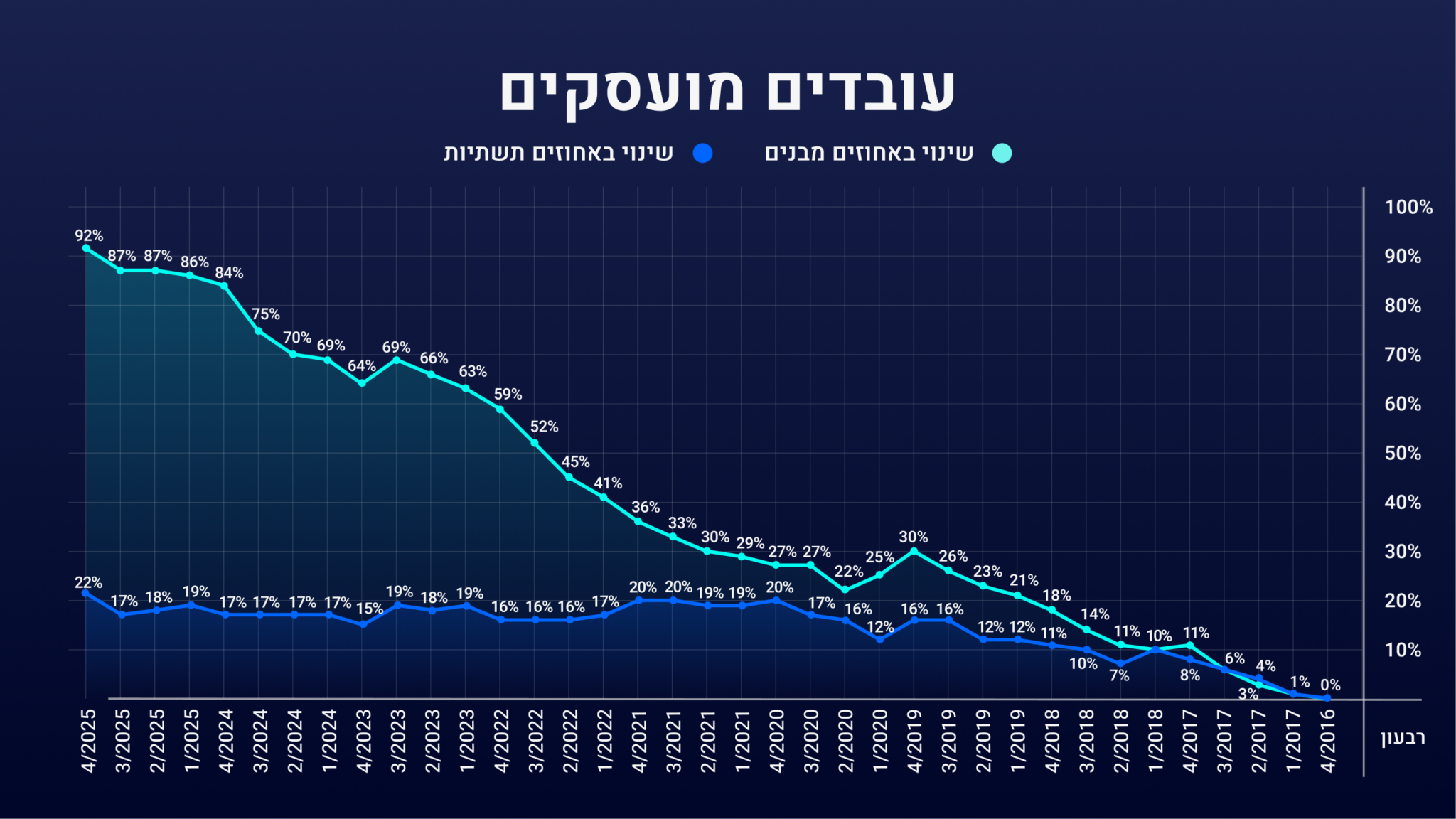 בתחום התשתיות – לאחר מגמה מתמשכת של יציבות לאורך כשנתיים, ברבעון האחרון של 2025 הייתה עליה של 4% בכמות העובדים.